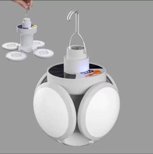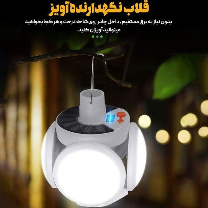 بدنه ساخته شده از جنس پلاستیک مقاوم در برابر ضربه، دارای ۵ عدد لامپ SMD با نوردهی مهتابی و توان خروجی کلی ۴۰ وات قابلیت تنظیم زاویه نوردهی برای هر چراغ تا ۹۰ درجه، شار نوری ۲۴۰۰ لومن و مقاوم در برابر پاشش قطرات آب (استاندارد IP65) ۴ عدد نشانگر LED به منظور نمایش وضعیت شارژ باقی مانده و کلید فیزیکی به منظور روشن و خاموش کردن دارای قلاب جهت آویزان کردن از روی سطوح، ۴ حالت نوردهی قوی، ضعیف، چشمک زن و حالت ذخیره نیرو تامین انرژی از طریق باتری لیتیومی داخلی قابل شارژ توسط برق شهری و پنل خورشیدی