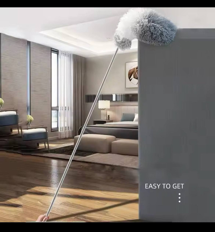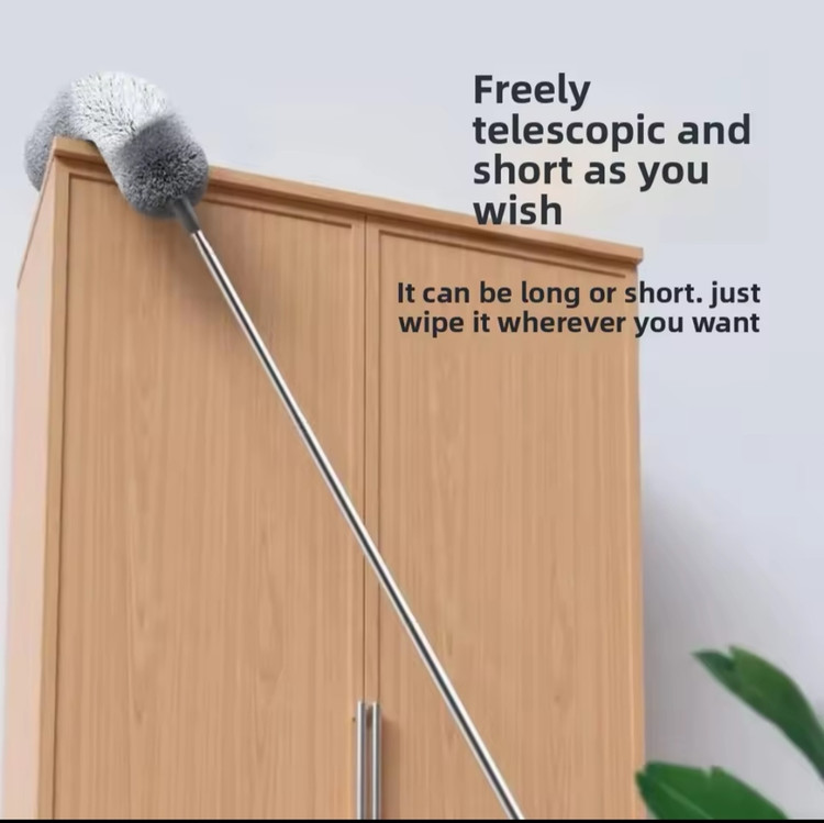 گردگیر دسته بلند تاشو با طول دسته در حالت باز 2 متر و 80 سانتی متر است که به صورت تلسکوپی جمع میشود که مناسب نظافت مکانهای خارج از دست مثل نور مخفی های سقف لوستر، داخل خودرو، بالای و دور قاب عکسها کتابخانه و بالای کمد،کولر گازی،قفسه ها و صد ها مورد دیگر