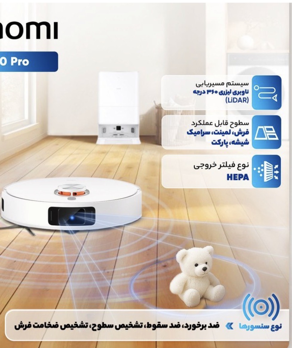 جاروبرقی رباتیک شیائومی x20 pro ، ترکیبیاز فناوری پیشرفتهو طراحی هوشمند استکه نظافت منزل رابه تجربهای بینظیر تبدیل میکند. X20 pro باویژگیهای نوآورانه خود، بهطور کامل نیازهای شمارا برآورده میکند . استفادهاز لیزرهای پیشرفته برای نقشه برداریو انتخاب دقیق مسیر برای تمیزکاریاز دیگر ویژگی هایاین رباتیک هوشمند میباشد. باقدرت مکش ۷۰۰۰ پاسکال میتواند زبالههاو گردو خاکو مو هارا بی دردسراز روی زمین جمع کند. جاروبرقی رباتیک شیائومی x20 pro بادو موپ چرخانو ضخیم درحین تمیز کردنبا سرعت بالایی می چرخد وتمامی لکه هارا پاک میکند. فرآیند شستشوی موپ پدبه این صورت استکه پد بهسرعت بافشار آب خیس میشود وبرای تمیز شدن میچرخد . پساز اتمام فرآیند تمیزکردن پد بطور خودکار باهوای داغ بهطور متوسطدر مدت ۳ ساعت خشک میشود. باجریان هوای قوی بهسرعت محتویات مخزن گردوغبار را بهکیسه گردوخاک منتقل میکند . ظرفیت این کیسه گردوخاک ۲.۵ لیتر میباشد ، کافی است هر ۷۵ روز یک بار برای تخلیه اقدام کنید کهالبته این زمان بستگی بهاستفاده شمااز جاروبرقی رباتیک شیائومی x20 pro دارد .جاروبرقی رباتیک شیائومی رامیتوانید ازطریق اپلیکیشن مدیریت کنید وطبق نیاز خود برای جاروبرقی رباتیک X20 pro برنامه ریزی کنید تاتمیزکاری راانجام دهد همچنین میتوانید مناطق ممنوعهرا مشخص کنید ،یعنی مناطقی که نمیخواهید رباتیک x20 pro آنجا را تمیز کندویا مناطقیرا مشخص کنید کهچند بار آنجارا تمیز کند. کنترل جاروبرقی رباتیک شیائومی x20 pro ازراه دور حتی زمانی کهدر خانه نیستید بهراحتی خانه خود راتمیز کنید . هنگامی کهخارج ازخانه هستید، بایک کلیک سریع روی برنامه Mi Home/Xiaomi Home، کارهای تمیز کردن رااز راه دور شروع کنید. عملکردهای سفارشی مانند تمیز کردن برنامه ریزی شدهو تنظیمات مربوطبه مناطقی کهمیخواهید محدود شوندرا انجام دهید .بنابراین x20 pro تمیز کردن بدون دردسر رادر اختیار شما قرار می دهند. جاروبرقی رباتیک شیائومی X20 pro بهطور منظمو بادقت خانه شما راتمیز میکندو شما بدون دغدغه های نظافتیاز داشتن یک خانه تمیز لذت ببرید.